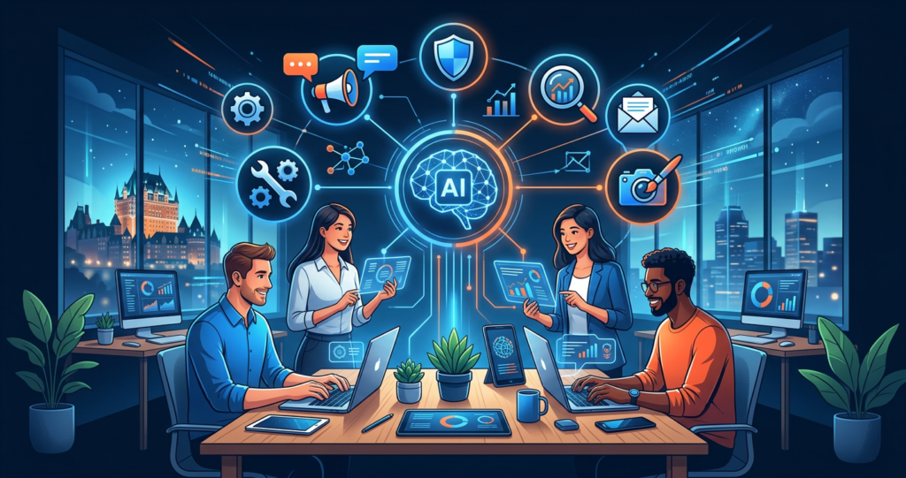 Maîtrisez le marketing IA pour votre PME québécoise. Guides pratiques sur Canva IA, l’email marketing automatisé, les réseaux sociaux IA, le SEO assisté par intelligence artificielle, ChatGPT pour le service client, et les campagnes publicitaires Google Ads et Facebook automatisées. Apprenez à créer du contenu de qualité en moins de temps, à attirer plus de clients organiquement et à vous démarquer de vos concurrents grâce aux dernières avancées en intelligence artificielle appliquée au marketing numérique.